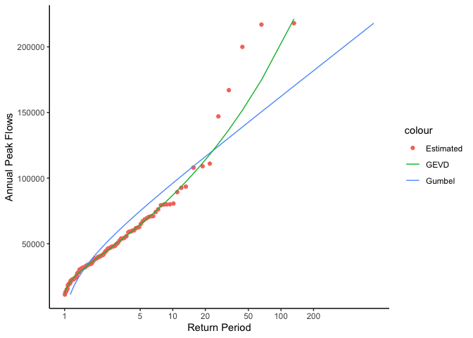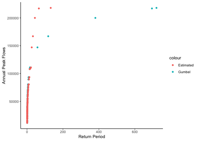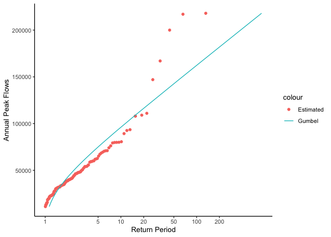 shape = shape))Now add a line showing flows you just calculated to the plot we made above showing the Gumbel fit. Does this approach work better in this case?