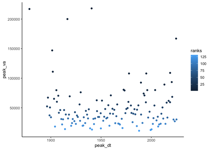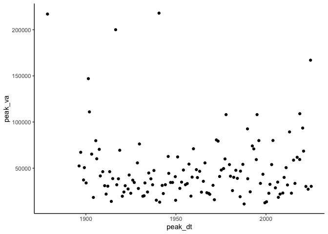 GET: https://waterservices.usgs.gov/nwis/site/?siteOutput=Expanded&format=rdb&site=03171000ggplot(peakflows, aes(peak_dt, peak_va))+