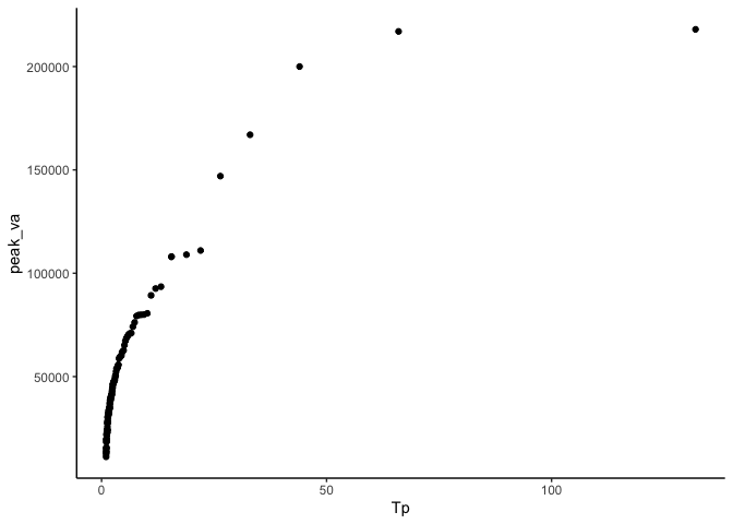 geom_line(aes(x = Tp_gumbel, y = peak_va, color = "Gumbel"))+